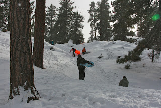On the last weekend of the year we were invited up to our friends (the Paulsen's) cabin in Big Bear. Kirk had to work on Friday and I had to do sharing time at church on Sunday, so we decided to go up just for the day on Saturday. I had looked at the weather report and there was only a 10% chance of snow. We left at about 9:00 that morning and were disappointed the closer we got to their cabin because of the lack of snow. There was enough for the kids to play around outside in, but I had pictured there being much more since it had snowed earlier in the week. We were in charge of lunch and had brought Papa Murphy's, so when we got there we heated it up while the kids played around. We then noticed it was starting to snow! After lunch we headed out to a place Carly noticed had a good amount of snow and would be great for sledding. By the time we got there it was snowing really good. And snowing it kept on doing...for hours. It was a blast! Sledding was so much fun and the fact that it snowed really good was icing on the cake. It ended up snowing so much we got stuck for the night. It was too late to go out and get chains, so we spent the night and the next morning Brian took Kirk to Kmart to get some, but it still wasn't going to be in time to get to church, so we stayed, went to the ward up there and then headed down the mountain. It was such a fun and unexpected weekend!